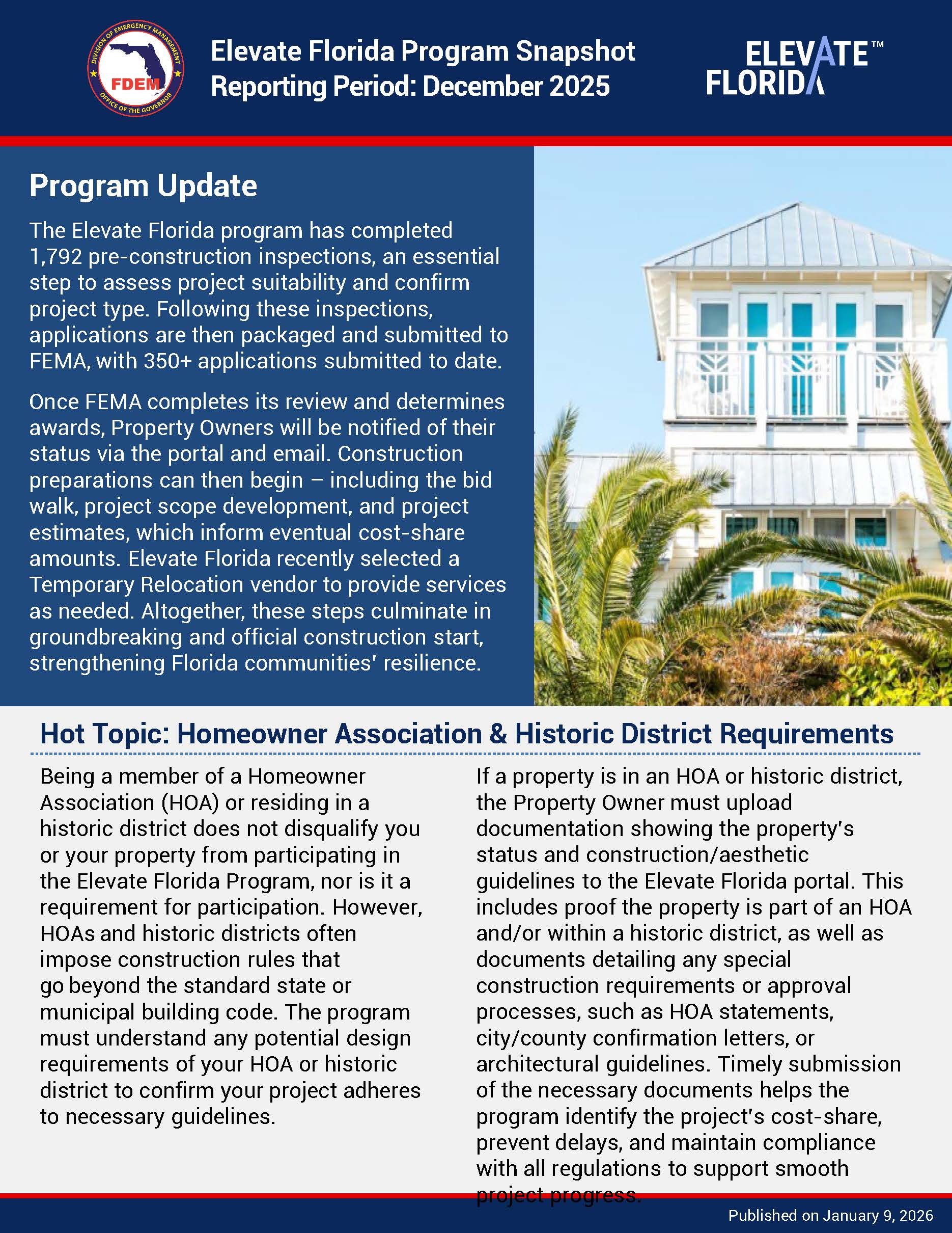 In September 2025, the federal funding cap for mitigation reconstruction projects through Elevate Florida was raised from $220,000 to $375,00 to reflect rising construction costs. Now, federal support for eligible "hard costs" (such as demolition, utility connections, framing, and flooring) is capped at $375,000, up from the previous $220,000. The cap applies only to direct building expenses and does not include design, permits, or accessibility upgrades. Property Owners will have to pay for all hard costs above the hard cost funding cap, in addition to their cost-share of the project.